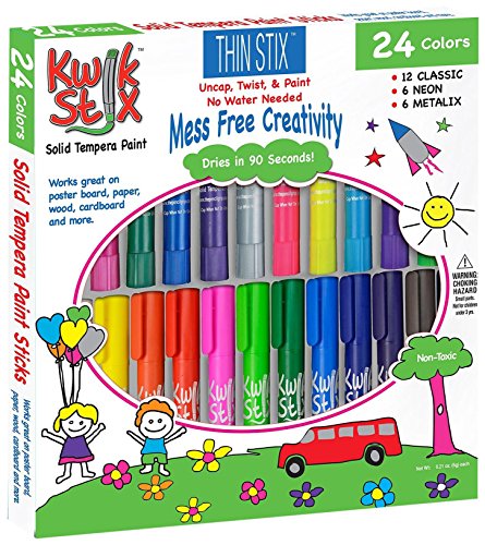 Kwik Stix is a game changer here! The Thin Stix are thinner versions of Kwik Stix, which are thin tempera paint pens. You simply uncap, twist and paint. The paint dries in about 90 seconds and I don’t have to worry about mixing paints or cleaning a bunch of supplies. Don’t let the time it takes to dry fool you … the art your child creates will still look like paint … not marker or pen.