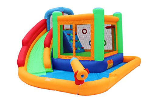 • 【8-in-1 Experience Endless Playfulness】 Our inflatable bounce castle combines with 2 long slide, 2 water gun, 2 sprinkler and 3 fountain, basketball shooting, 2 huge splash pool, bounce area, climbing wall, and 6 soft water balls shoot each other. The kids pool inflatable can be filled with water, ocean ball or sand, which is adding much fun to play. And Just connect the hose and it can be used as a water park. Make the party more shining than ever.