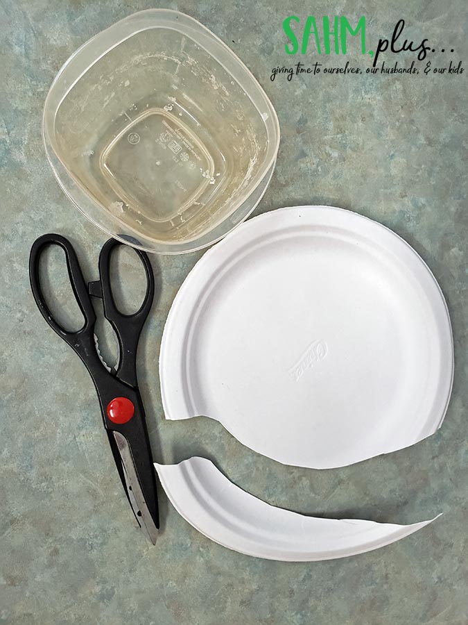 Cut the rounded edge off the paper plate so that there’s enough room to slide it under your bowl or cup.