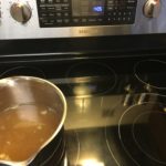 homemade chicken broth coming to boil for chicken and yellow rice dinner
