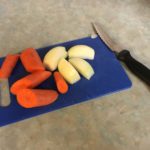 Chop ends off carrots (and celery if using) and cut in large chunks. No need to peel. Place in crock pot with chicken bones