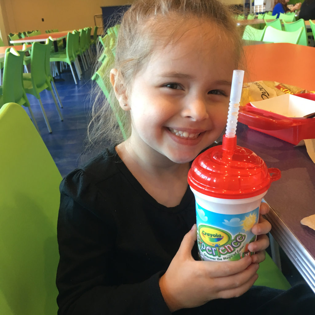 We spent the previous two days in two of the Disney Parks, exhausted and frustrated with a teething baby. Sleep hadn’t come easily for us between an odd night my husband spent sick and another night S kept bumping into the wall throughout the night. Our plan was to visit The Crayola Experience for a few hours, then head home. To tell the truth, I wanted to call it off and just hit the road. But, we carried on as planned. I promised a review and this happened to coincide with my daughter’s reward for filling her reward jar. It would have been wrong not to follow through with our commitment.