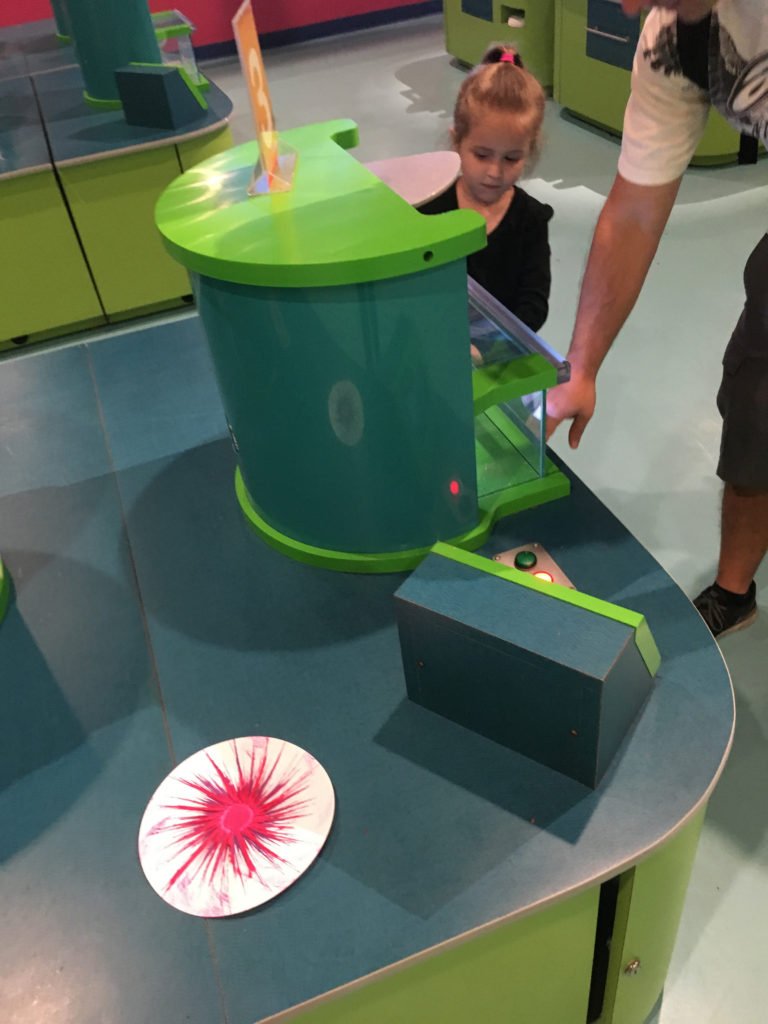 The other attraction that requires a token. If you’ve used all your tokens, you can purchase more here as well. Use your token to select one of about 6 colors of modeling clay. Then, head over to one of the tables where markers and clay tools are set out for some creative fun. While S was busily cutting, squishing, and drawing on her clay, B decided to taste test his. Oops! If you could have seen his face, you’d have known immediately the modeling clay was not a satisfying flavor.