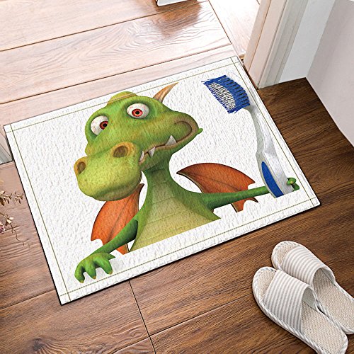 A realistic dinosaur wearing a shower cap and a shower puff hanging from his mouth is peaking out of the shower curtain in this comical bath mat.