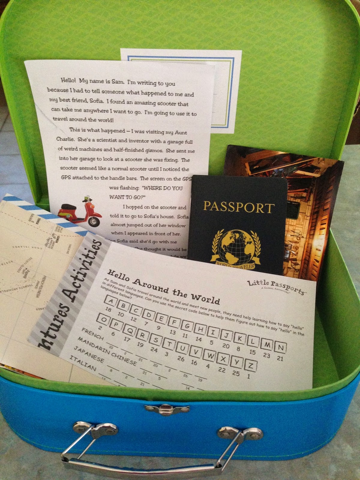 We received the 1st month of the World subscription, which arrived with a suitcase with other introductory items that will be used in subsequent months. It’s important to note that the first month is the introduction to Little Passports. Your child will read about Sam and Sofia, who will be your child’s pen pals. Items in the suitcase include: