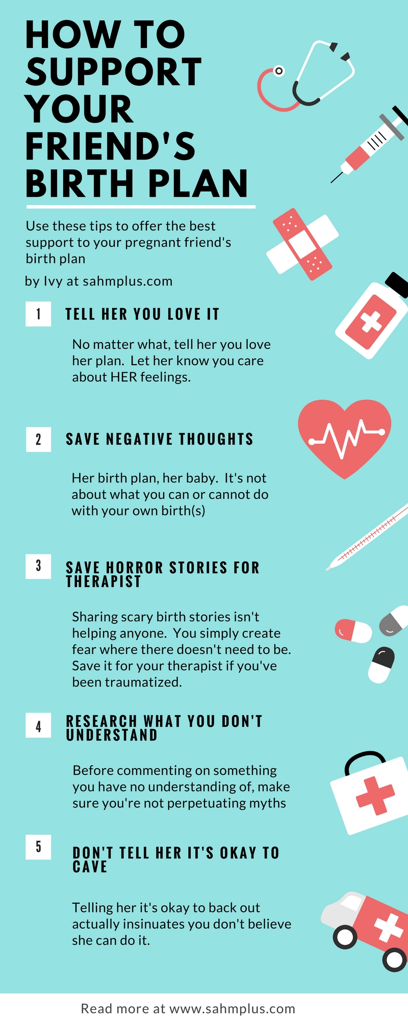 - Tell her you love it. First and foremost, tell your friend you love her birth plan. Let her know you support her decisions without question!